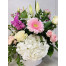 Lovely arrangement of assorted flowers in the pinks and white with delicate greenery in a white ceramic pot.