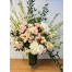 Une magnifique composition florale en hauteur de fleurs blanches et roses.