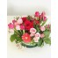 TRÈS JOLIE ARRANGEMENT, STYLE CENTRE DE TABLE, DANS LES TONS DE ROSE ET FUCHSIA AVEC CERAMIC ROND ET BAS DE 6 POUCES.
